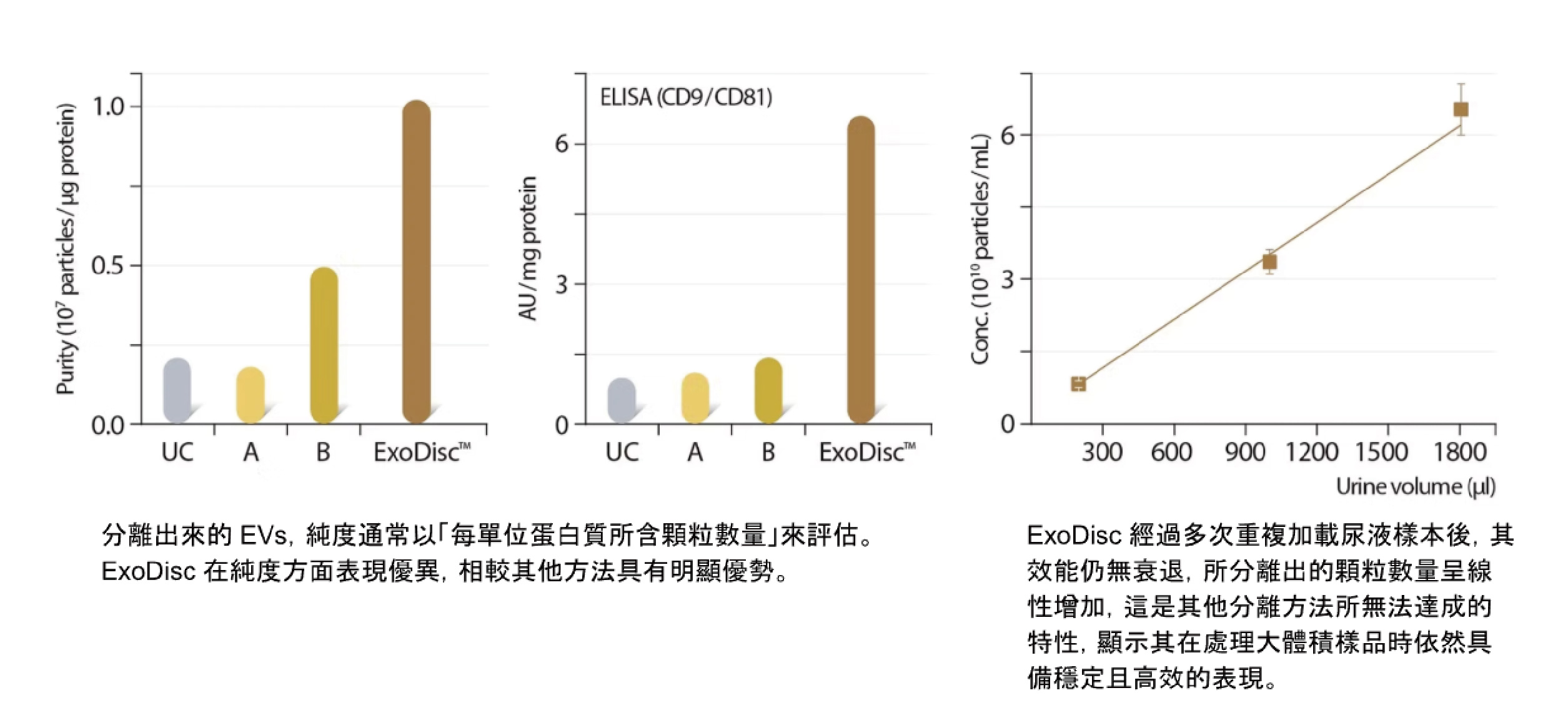 本次 ExoDisc 效能測試,將有轉染 AR-FL 與 AR-V7 的 PC3 細胞(ATCC CRL-1435)所生產的 EVs 加入至健康捐贈者的尿液 (4mL) 中進行不同純化方法學的比較實驗。純化後的 EVs 透過以下方法進行分析:奈米顆粒追蹤分析(NTA)、酵素連結免疫吸附分析(ELISA)以及聚合酶連鎖反應(PCR)。