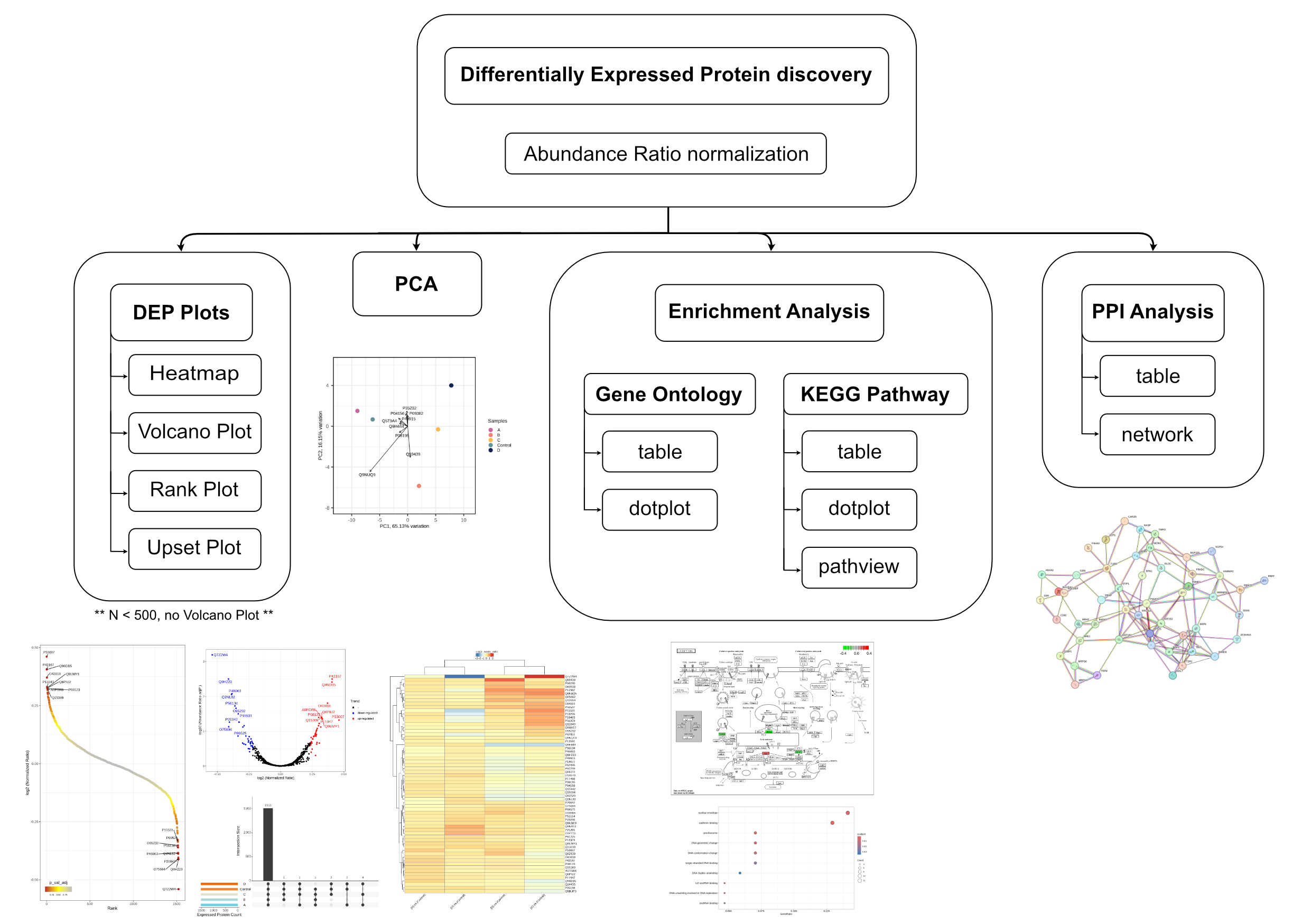 透過 Proteome Discoverer 軟體進行運算分析,我們可以篩選出差異蛋白的詳細數據。接著,利用 clusterProfiler 軟體進行基因富集(enrichment)分析,包括生物學過程(biological process)、分子功能(molecular function)和細胞成分(cellular component)等 GO 類別,以反映差異蛋白在基因表現上的狀況。同時,透過 KEGG 分析能夠深入了解蛋白質的生物途徑和功能。PPI 分析則提供了在富集基因中相互作用和作用強度的網路關係。